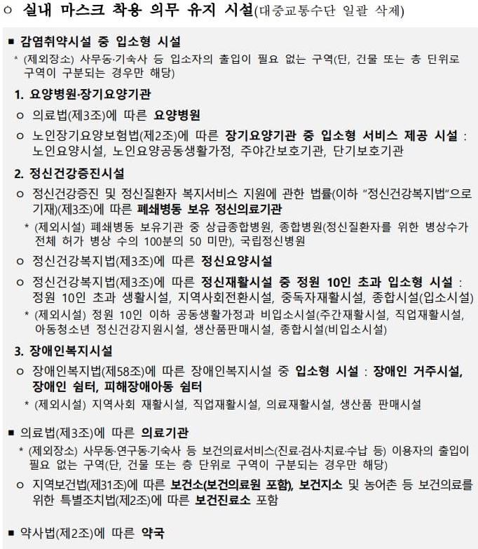 병원이나 약국 의료시설 등 환자가 다수 있는 기관에서는 여전히 마스크는 필수입니다.약국은 의료기관 이용 후 바로 찾는 경우가 많아 코로나19 확진자나 의심 증상자, 고위험군이 이용할 가능성이 크다는 점을 고려해 착용 의무를 유지했습니다. 병원 등 의료기관과 일반 약국, 요양병원·장기요양기관, 정신건강증진시설, 입소형 장애인복지시설 등 감염 취약 시설의 경우도 마스크 자율화의 이점보다는 코로나19 바이러스 노출에 따른 위험이 더 클 것으로 판단돼 마스크 착용을 계속 의무화했습니다.
